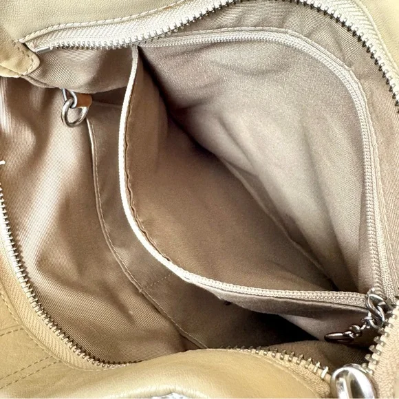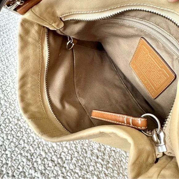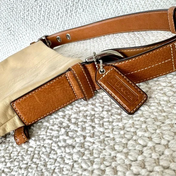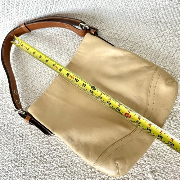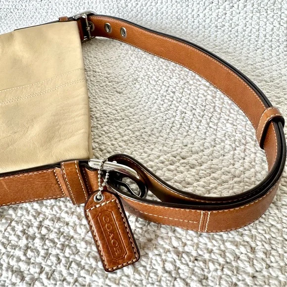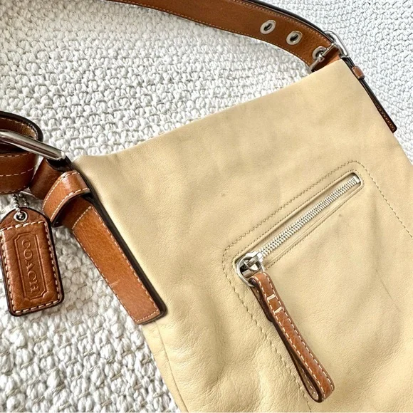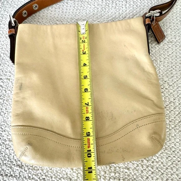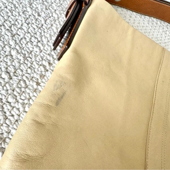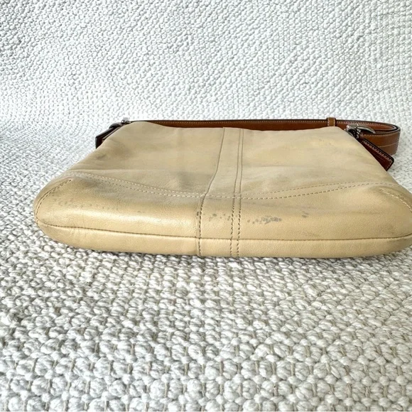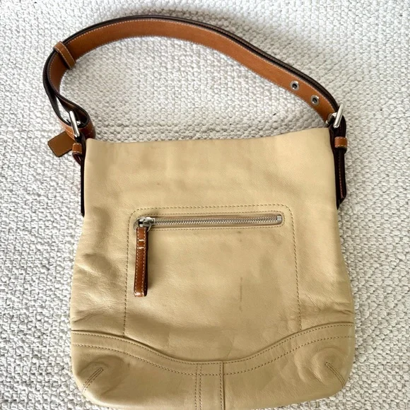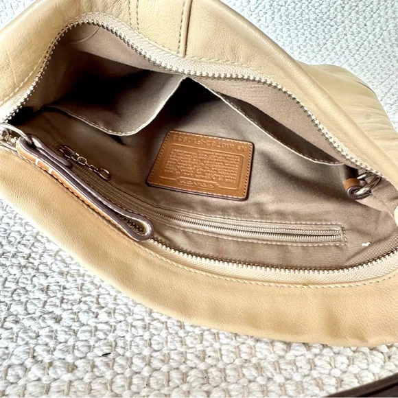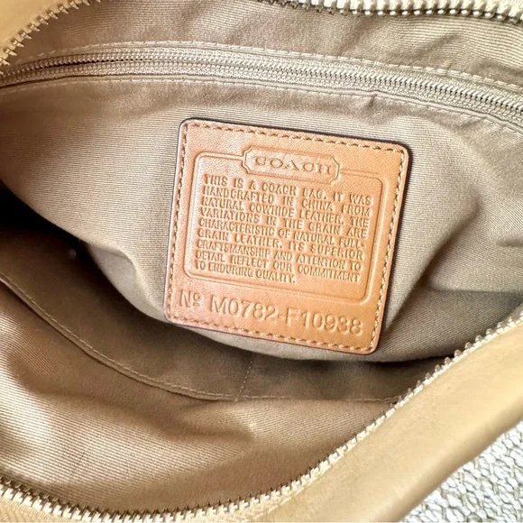 This classic Coach shoulder bag is in a soft cream tone and offers a timeless and versatile look. Crafted with attention to detail, it features a relaxed rectangle shape and a comfortable adjustable shoulder strap, making it an ideal accessory for any occasion.The leather has some spots as shown. Please see all photos for details. The bag is 100% authentic. See photos of inside tag for bag number.