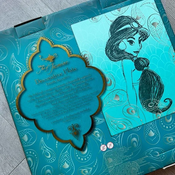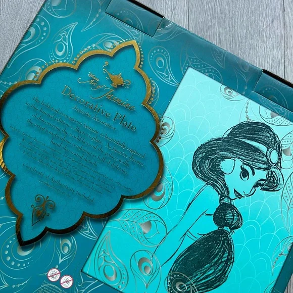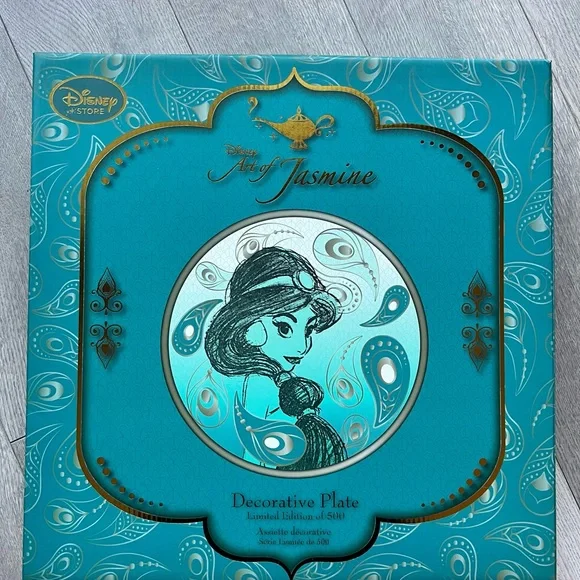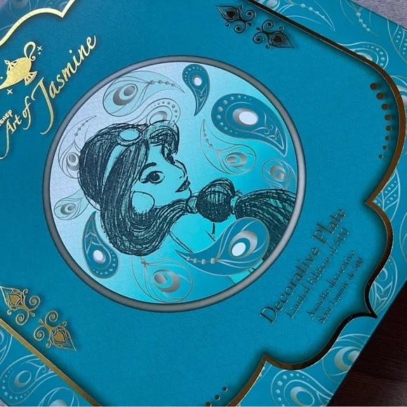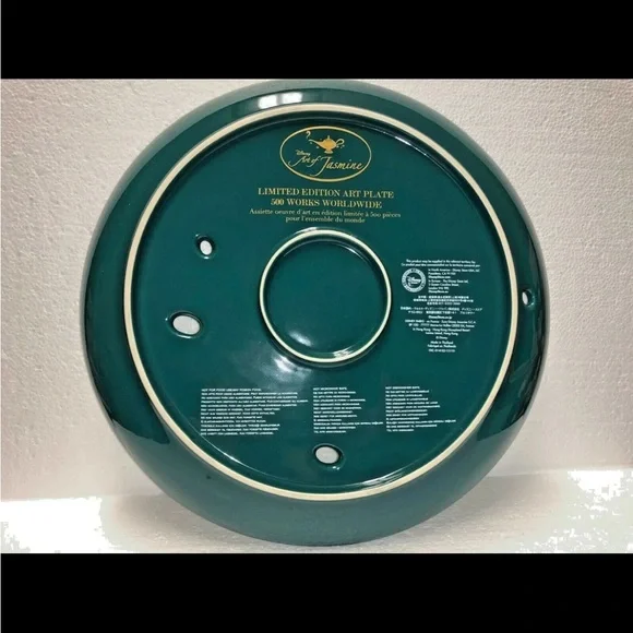Disney D23 Art of Jasmine Limited Edition Decorative Plate Limited Edition of 500 • Limited Edition of 500• Includes Certificate of Authenticity• Includes plate stand• Design incorporates holes in the paisley pattern• Not for use with food. Decorative item only• Celebrating the return of Disney's classic Aladdin on DVD and Blu-ray disc• Part of the Art of Jasmine Collection• 14'' Diameter x 1 1/4'' D• New in Box
