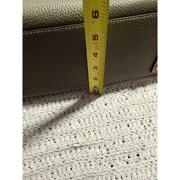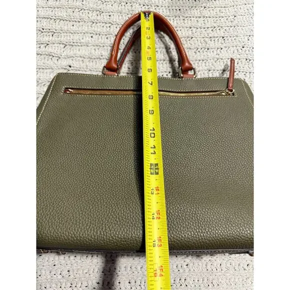 Dooney & Bourke Pebbled Leather Grain Zip Structured Satchel MSRP $478 R1930SM Green BrownCondition: Pre-owned - excellent - super cleanBrand: Dooney & BourkeGender: WomensCategory: PurseSize: Handle drop length: 5".H 9.75" x W 6.25" x L 13"Color: Olive Green, BrownThis satchel, made from textured leather with a natural grain that hides any signs of wear, is perfect for a weekend outing but sleek enough for work as well.Rich European pebble grain leather.Magnetic snap closure.Does not include shoulder strapOutside front and back zip pocket.One inside zip pocket.Two inside pockets.Cell phone pocket.Inside key hook.Lined.Feet.Magnetic snap closure.Dooney and Bourke Plaque and Gold tone hardware.