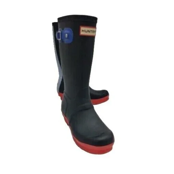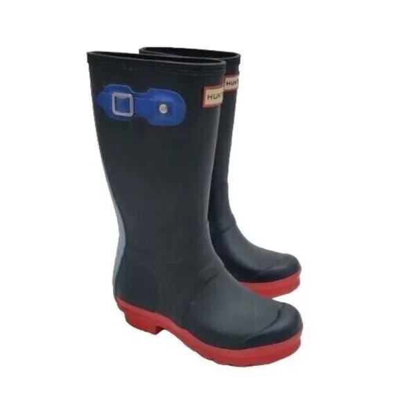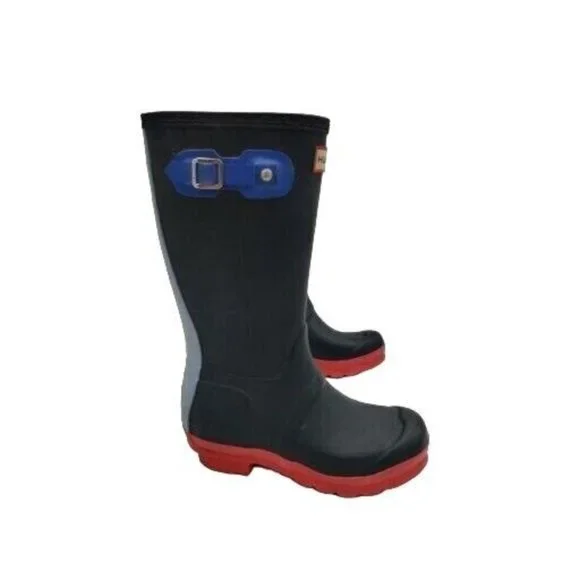 This Hunter rain boot in Midnight Sky Blue Stripe is a must-have for any child's shoe collection. The slip-on style makes it easy to wear and the durable rubber material ensures long-lasting use. The buckle and logo accents add a stylish touch to this limited edition design.Perfect for casual occasions, this flat rain boot features moderate cushioning and a high top shaft style for added comfort and protection. The unisex design and solid blue color make it a versatile option for any child. Available in US shoe size 3 and UK shoe size 1, this Hunter Wellington Rainboot is a great addition to your child's wardrobe.