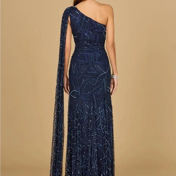 True size 6 dress or jeans size unlike some dress companies. Wore for daughter’s wedding. Very stretchy & comfortable. Lighting in photograph shows lighter beads on the model, but it’s all navy.
