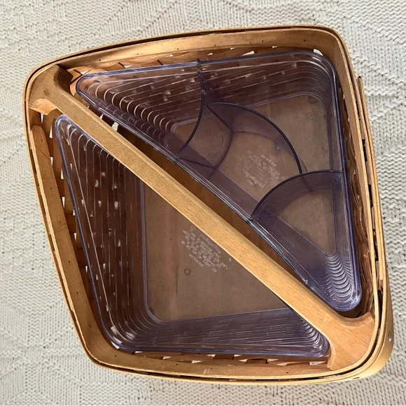 Longaberger Spin Organizer Lazy Susan Basket with Heavy duty plastic divider inserts. Spins well. It has a small amount of speckling and some pen ink marks on the bottom of one of the plastic divided inserts… please see pictures. Has all of its parts. Warm brown. Excellent used condition. Very useful helpful basket.