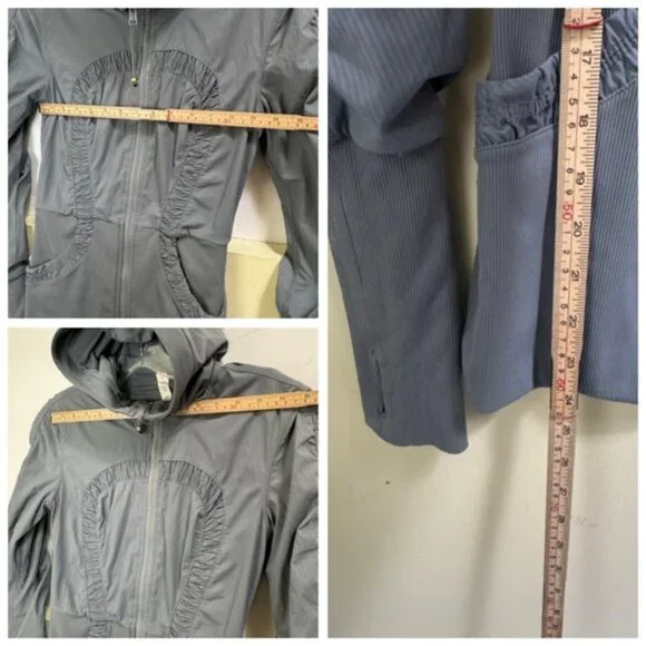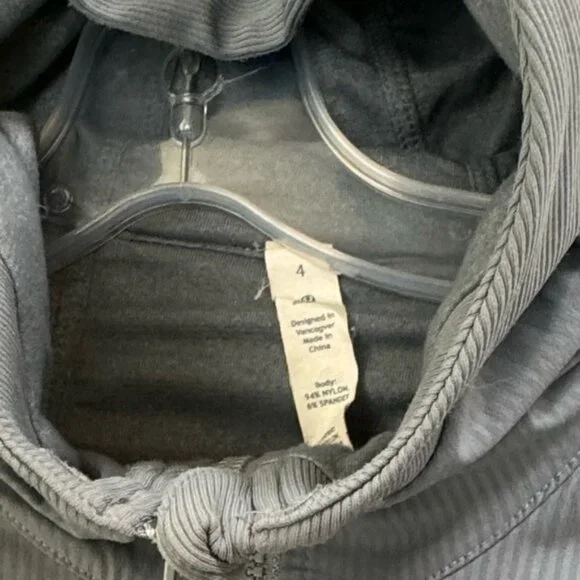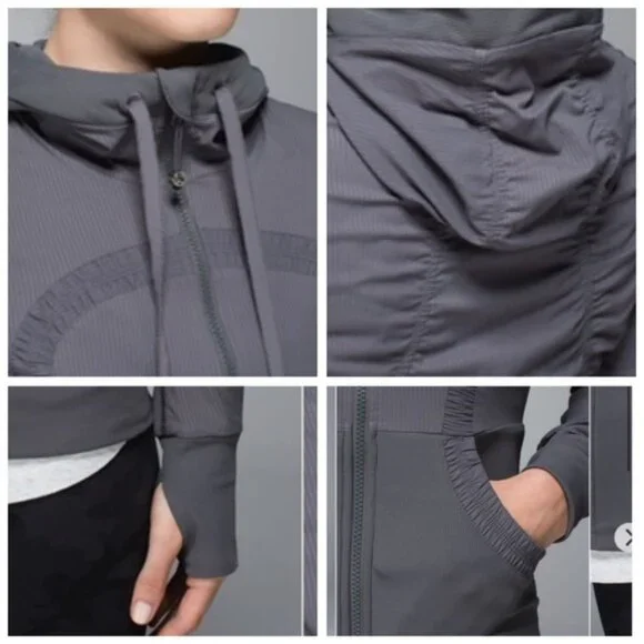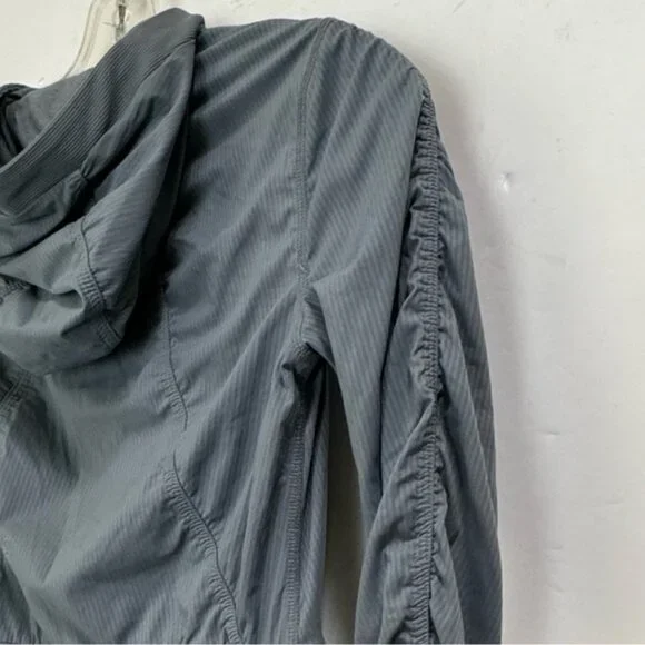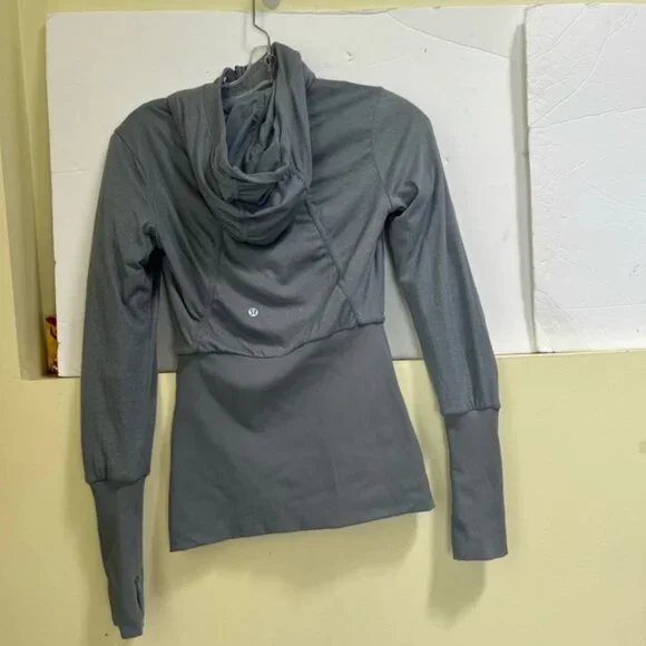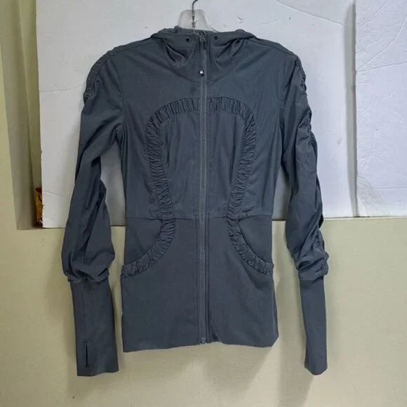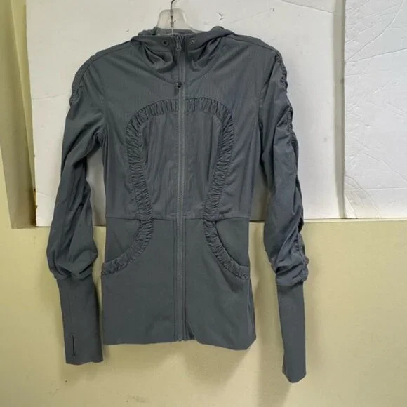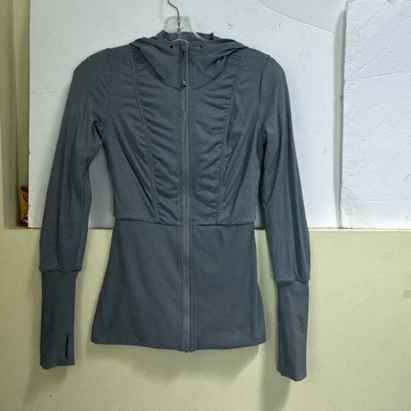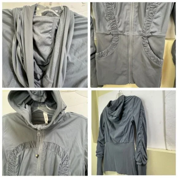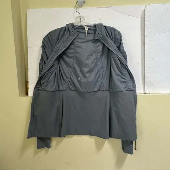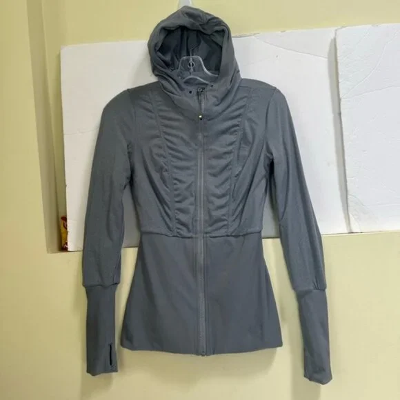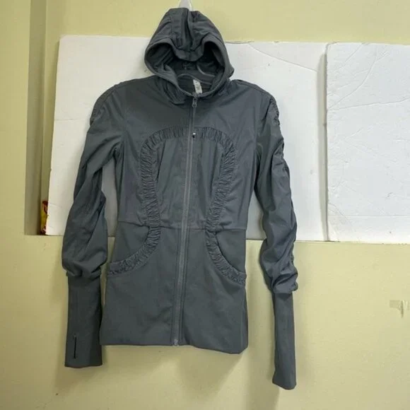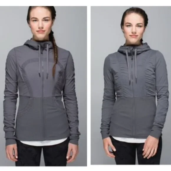 Lululemon Dance Studio Jacket III Swift Hoodie Jacket Full Zip Ruched LogoRARE Size 4Gray - Hood Soot LightSwift fabric has us covered when we're wearing it on its own. Bonus alert - this jacket is reversible (it's even ready for when we change our minds).Reversible jacket with hood in Swift lightweight fabric — breathable and has two-way stretchSoft, four-way stretch Sheer Luon fabric lines ThumbholesFull zipperPocketsMfabric(s): Sheer Luon®, Swift soft cozyproperties: moisture wicking, preshrunk, reversible, breathable, chafe resistantfit: tightlength: mid-hipGood gently used condition. No rips or stains. Signs of wear. NOTE: No ties at hood.