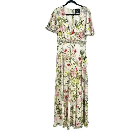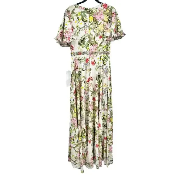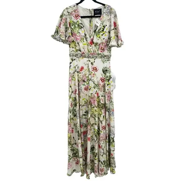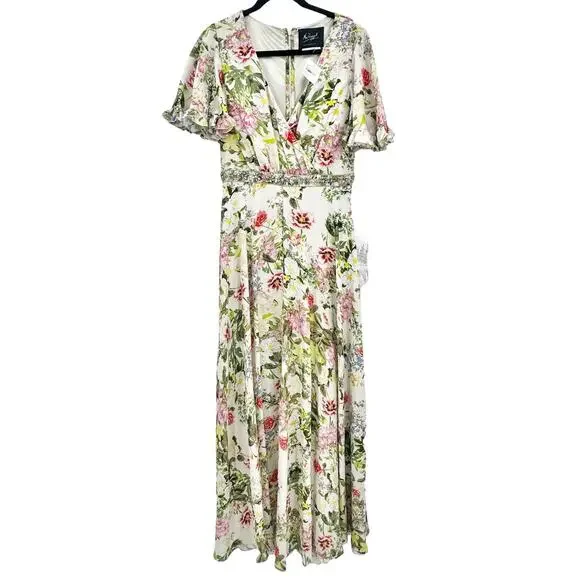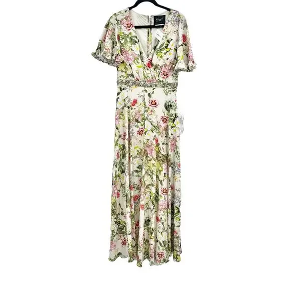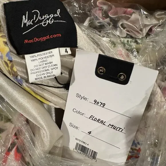 Mac Duggal Floral Print Faux Wrap Flutter Sleeve A-Line Gown Multicolor 4 NWTApproximate Measurements This floral print gown envelops you in chiffon luxury. The v-neckline and concealed back zipper make it a breezy and graceful number for your next social occasion. Slip into this gown and let the vivid colors transport you to a garden of feminine fancy.Wrap over bodice featuring pleated cummerbundV-necklineConcealed back zipperImportedEvening, Party, Trendy, Festival, Cardi, Western, Brandy, Off Shoulder, 80s, 90s, Cotton, Hippy, Marled, Tribal, Anthro, Girly, Embroidered, Lace, Embellished, Fitted.Mac#17