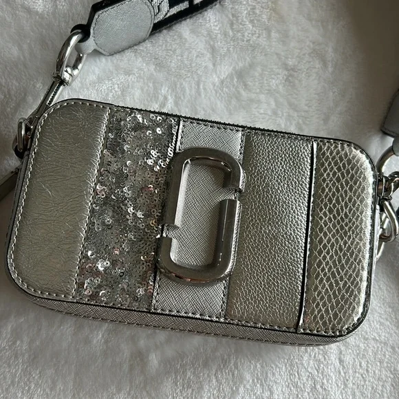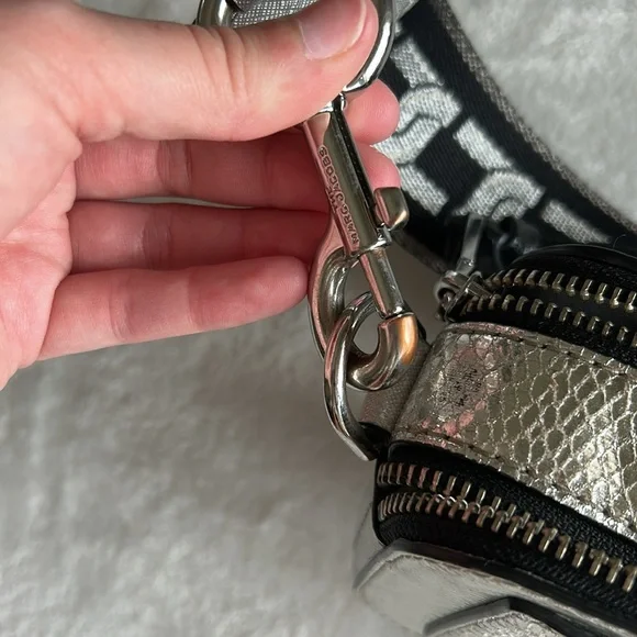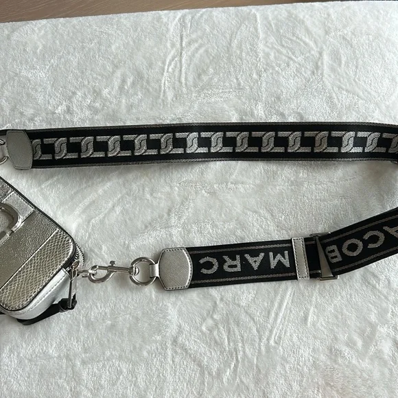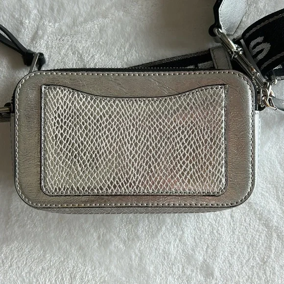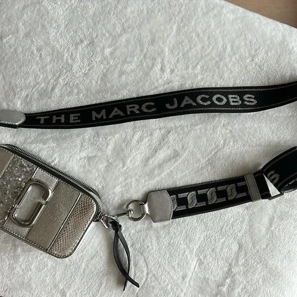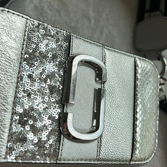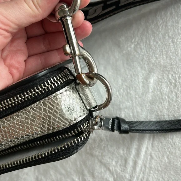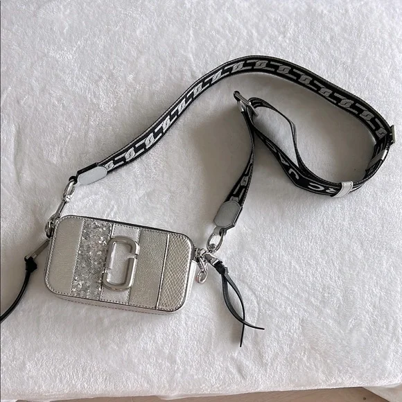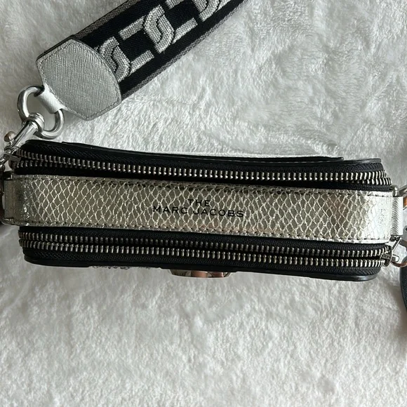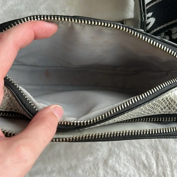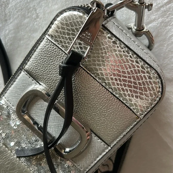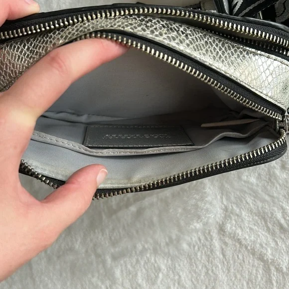 In great condition besides small stains inside, slight scratching on the front, and slight tarnishing on some of the hardware as shown.Saffiano leather exterior with twill lining.Two zipper compartments with extended leather pulls. Interior flat pocket and back flat pocket. Snake embossed, glittered, crinkled and grained panels. Double J hardware on front. Silver tone hardware. Measures approx 7.25" W x 4.25" H x 2.5" D.Detachable and adjustable logo webbing strap with a 20" drop. Revolve Style No. MARJ-WY568. Manufacturer Style No. H113L01FA21.