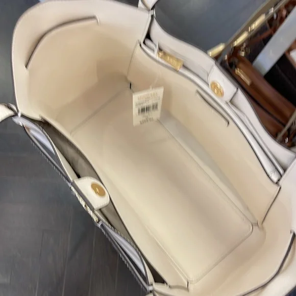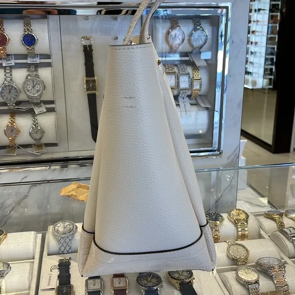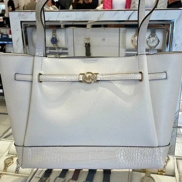 MICHAEL KORSReed Large Leather Belted Satchel Shoulder Tote Handbag Light Cream Crocodile NWT Authentic With its belted silhouette and roomy interior, the Reed tote is a chic companion any time of year. It has plenty of room to carry everything you need, and includes interior zip and slip pockets for storing smaller items. The clean lines and practical design of the bag allow for effortless styling.Crocodile • 100% leather from tanneries meeting the highest standards of environmental performance• Tote bag• Pebbled leather/snake embossed• 100% leather• Trim: 100% polyurethane• Gold-tone hardware• 16.5”W X 10.75”H X 7”D• Handle drop: 11.5”• Interior details: front slip pocket, back zip pocket• Snap fastening• Dust bag not included• ImportedMICHAEL KORSREED35F4G6RT3ALG BELTED TOTELEATHERMICHAEL KORS REED LARGE BELTED TOTE SHOULDER LEATHER BAG EXOTIC EMBOSSED OXBLOOD
