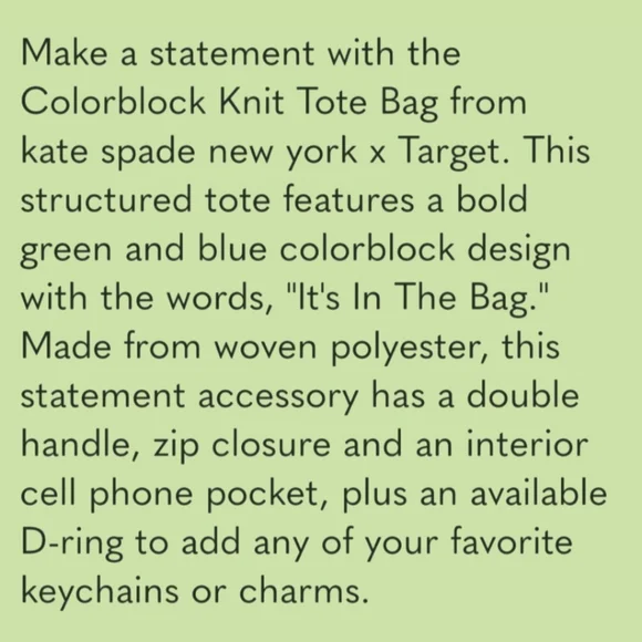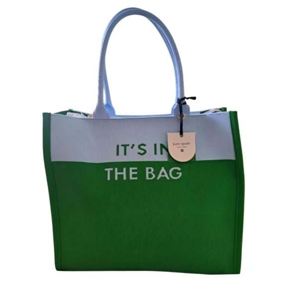 ✨️NWT💚Stylish tote with bold green and light blue design. Features 'It's in the Bag' text. Perfect for everyday use.✅Color may differ slightly than pictured due to lighting & device used to view item. Kindly ZOOM IN photos to see details as they are part of the description. 📸☑️Comes from a smoke-free & pet-friendly home.✔️Feel free to contact me if U have questions prior to purchase.