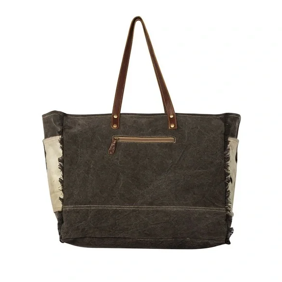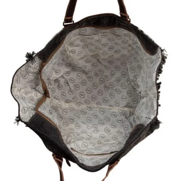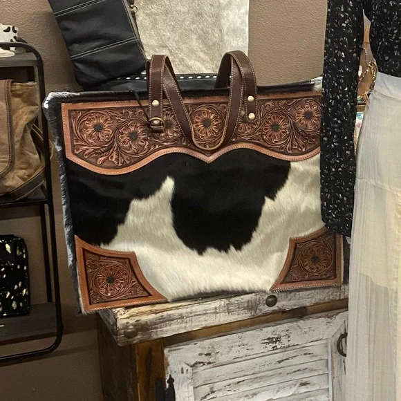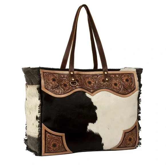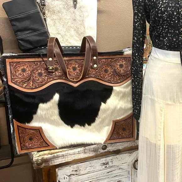 Get ready for weekends with this stylish and upcycled weekender bag with amazing tooled leather accents and cowhide front panel.This amazing bag measures 20” x 8.5” x 16” with 12” handles and is the perfect “weekender” bag made from genuine leather and canvas, and fits as a carry-on on most airlines.