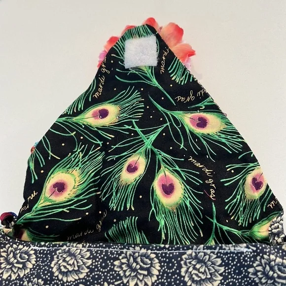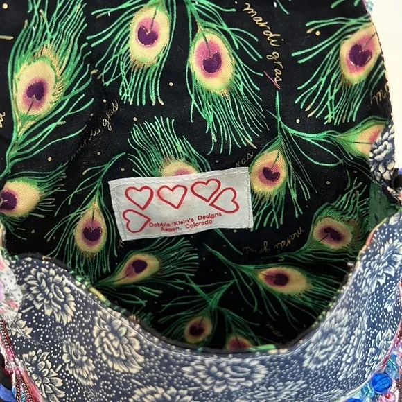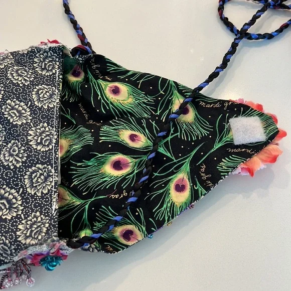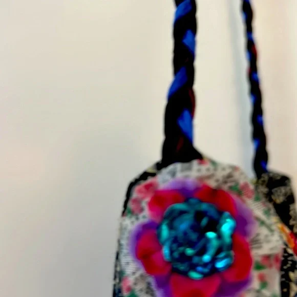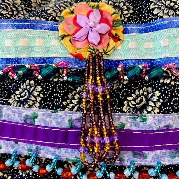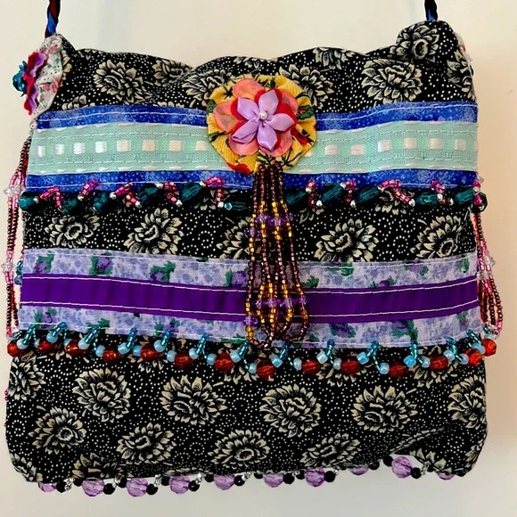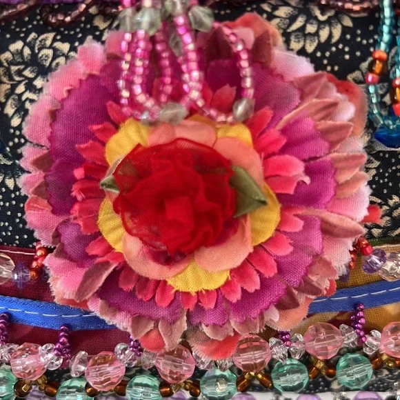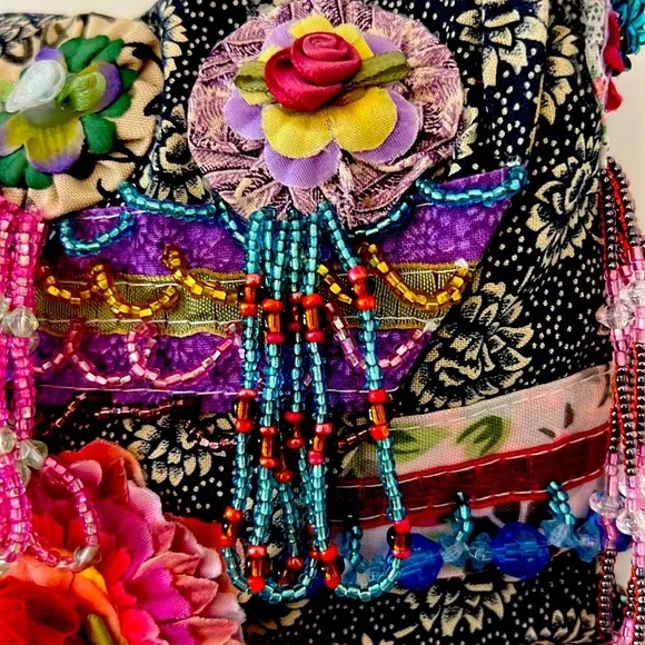 Wildly unique one-of-a-kind absolutely playful and completely handmade with lots of TLC. Created using myriad techniques —beading, stitching — made by one artisan in the USA 2005. Hand braided carry strap is 24” long for cross body. Charming fabrics and ribbons. Hand composed flowers. Hand-beaded tassels. V-Flap closure with velcro inside to secure. Fully lined. From Aspen CO. Barbiecore vibe!