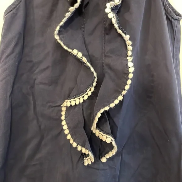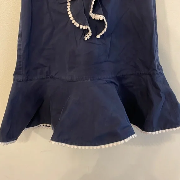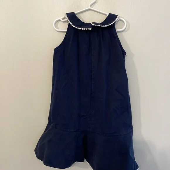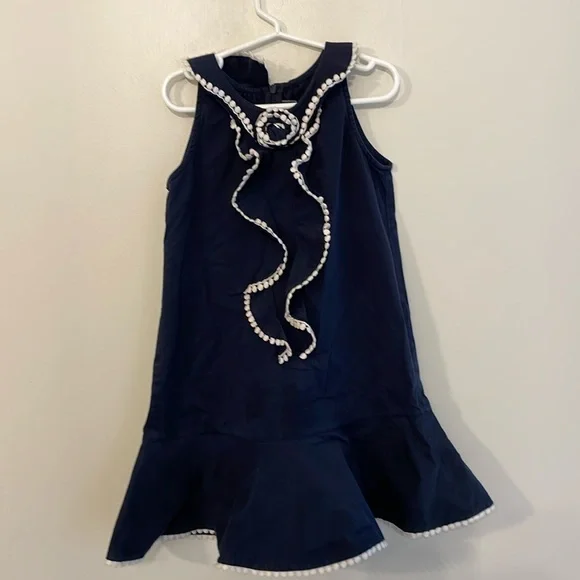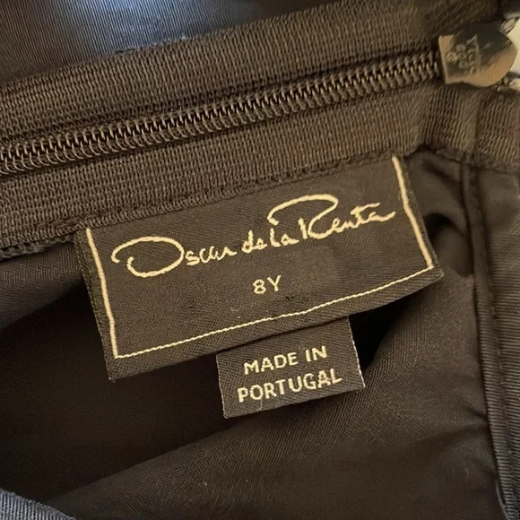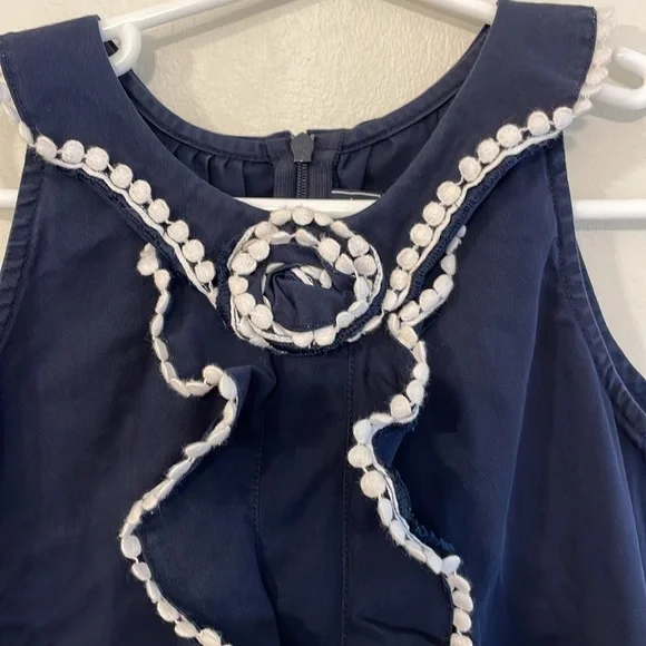 Oscar de la Renta Blue and White Dress kidssize 6Very good preowned condition Only worn for special occasions and dry cleaned First owner Slight fabric fadeThis Navy Blue frilled dress is made of a cotton and elastane twill with a sleeveless shape, crew neck, and flat collar.It has a special flared and flounced hem with stunning jabot on the front, fancy white poka dot embroidery and beautiful flower embroidery.Zipper down the back