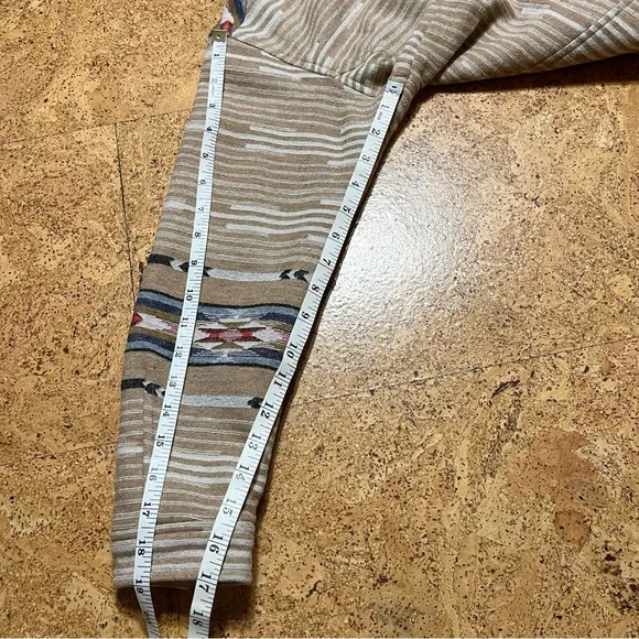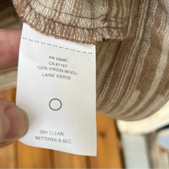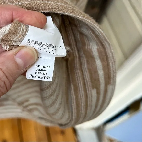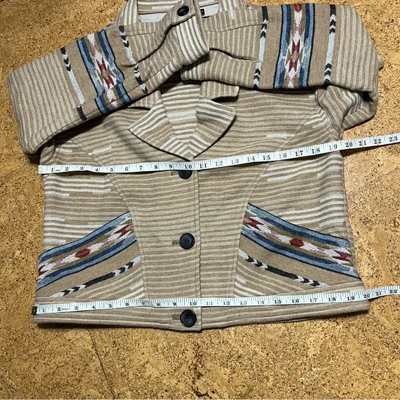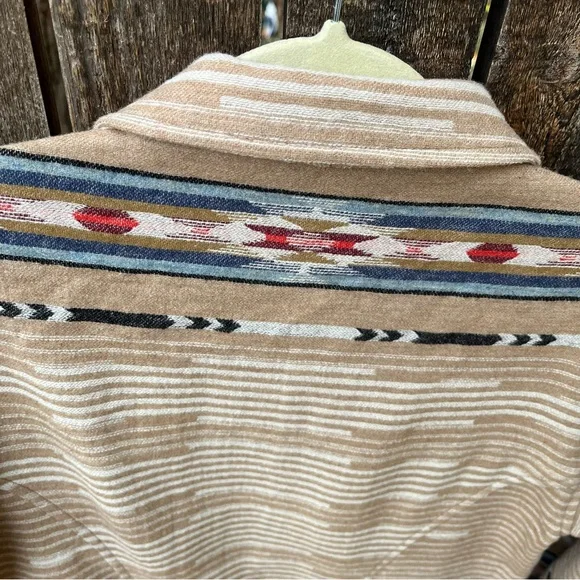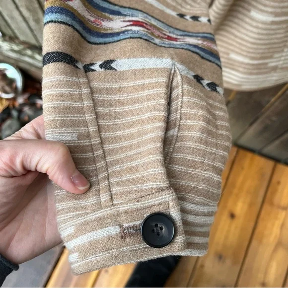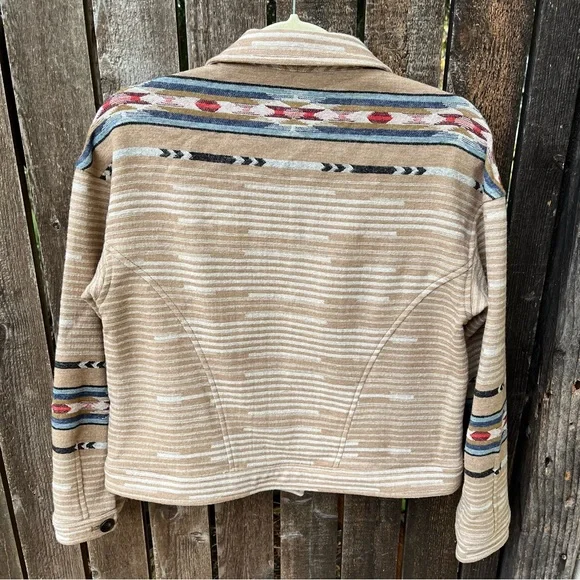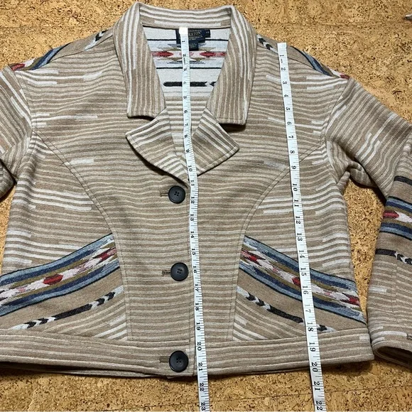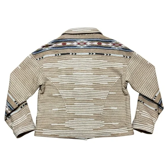 Pendleton Wm’s Reata Virgin Wool Jaquard Blanket Crop Jacket In Tan MixSz XS. New without tags. Beautiful cropped 100% virgin wool southwestern aztec woven jacket. Notched foldover collar with 3 button front closure & button sleeve cuff. 2 front pockets. Unlined. Tan & taupe with multicolored border accents. Great condition.