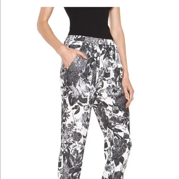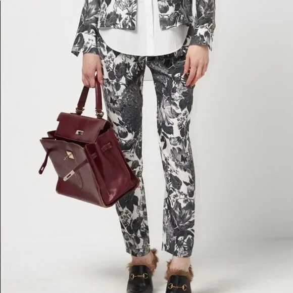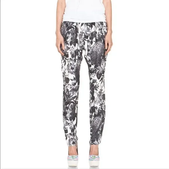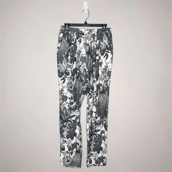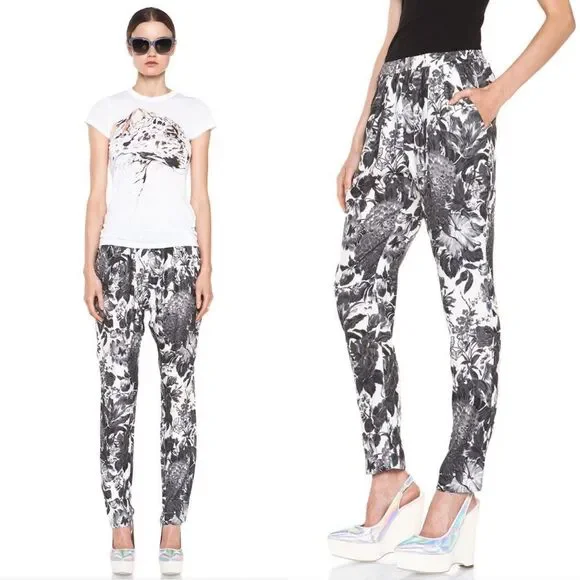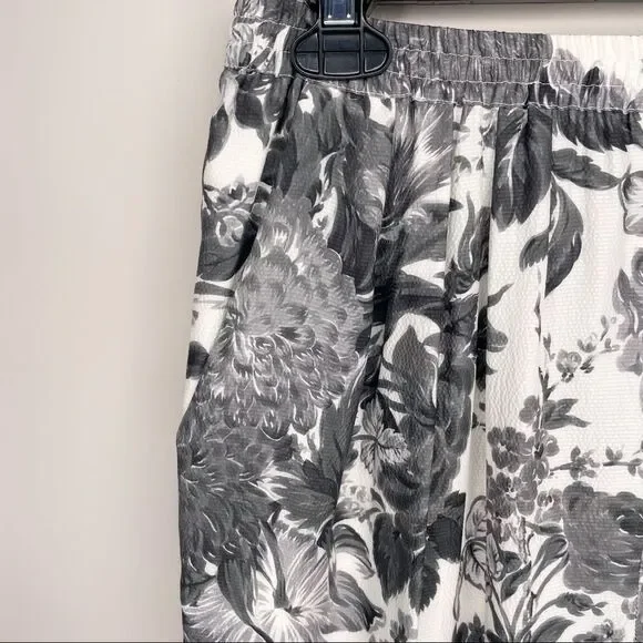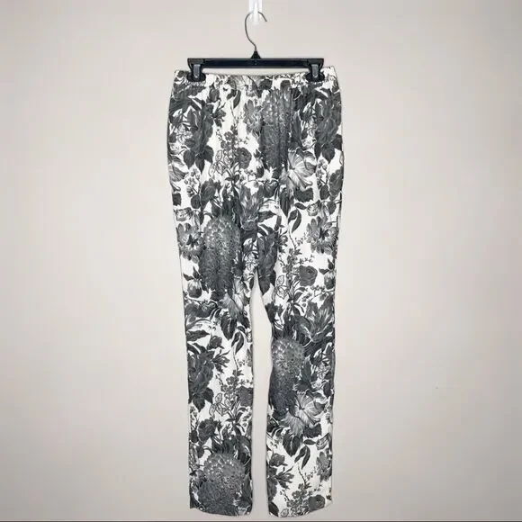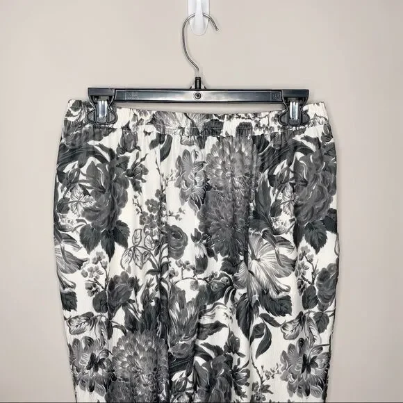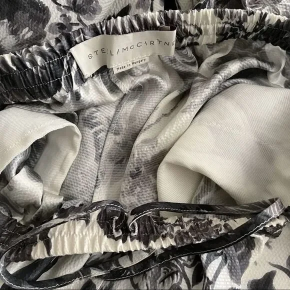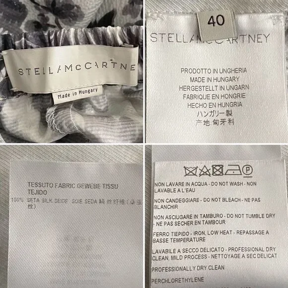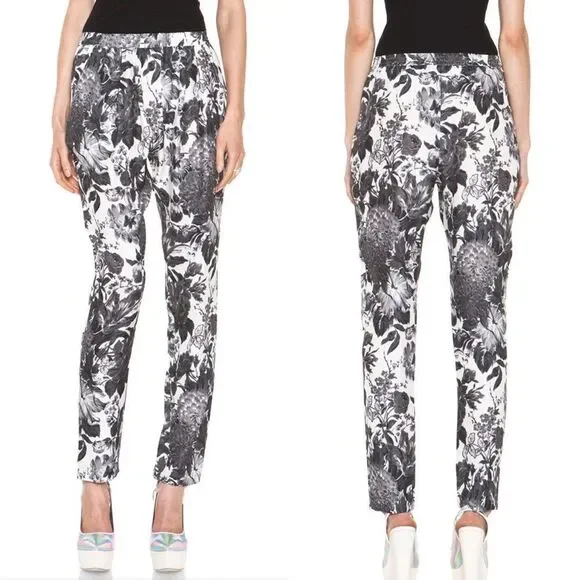 Stella McCartney Toile De Jouy Grey Floral Print Pull On Pants with an elasticized waistband and tapered leg. Perfect condition without flaws or any signs of wear. Rendered in hammered 100% Silk, these bring comfort and style to any occasion. Lightweight and unlined, these look perfect styled casual with a tee or dressed up with a silky top. Throw on a blazer and your office ready. High riseTapered leg Elasticized waistband Hidden, interior drawstring closureFront slash pocketsLightweightLightly textured100% SilkDry Clean Only(Have been dry cleaned since last worn)Made in HungarySize 40(US Size 6)14” across waist 20” across hips12” rise30” inseam12” leg openingS