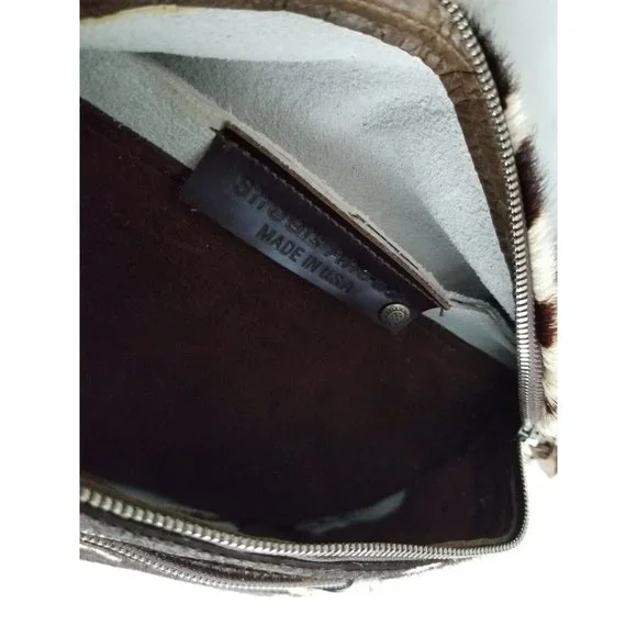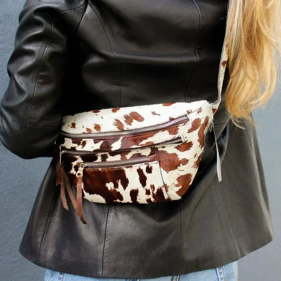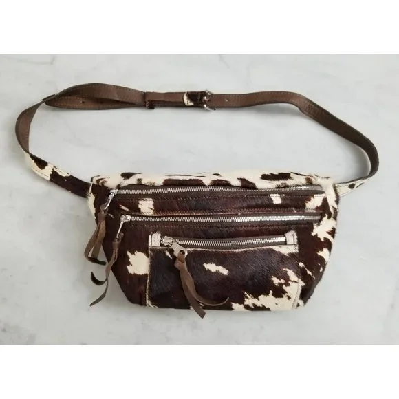 Streets Ahead Inc Harper Fanny Pack Cow Print Calf HairSize Extra Large XL Belt Bag (please reference measurements to help ensure a proper fit)can be worn as a crossbodyLarge travel fanny pack constructed out of brown and white cow print hair-on leather. Features three zippers and an adjustable buckle strapSourced in ItalyMade in the USAapproximate dimensions10 in wide6 in tall3 in deep40- 48 in strap length (adjustable)B36Thank You