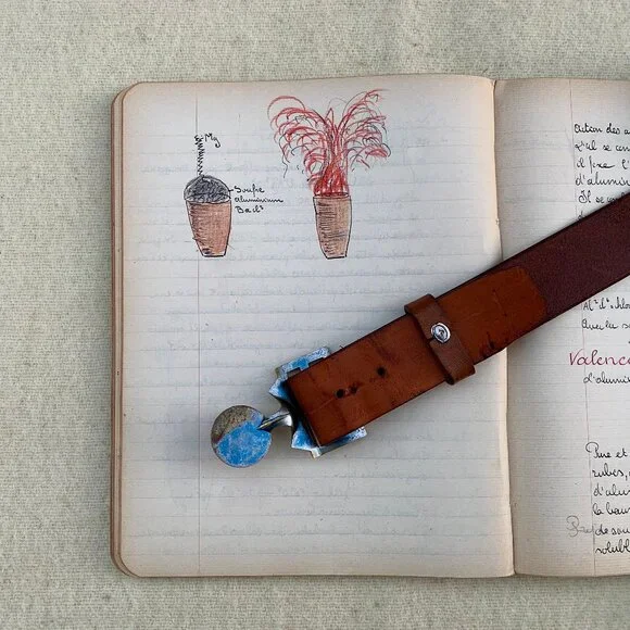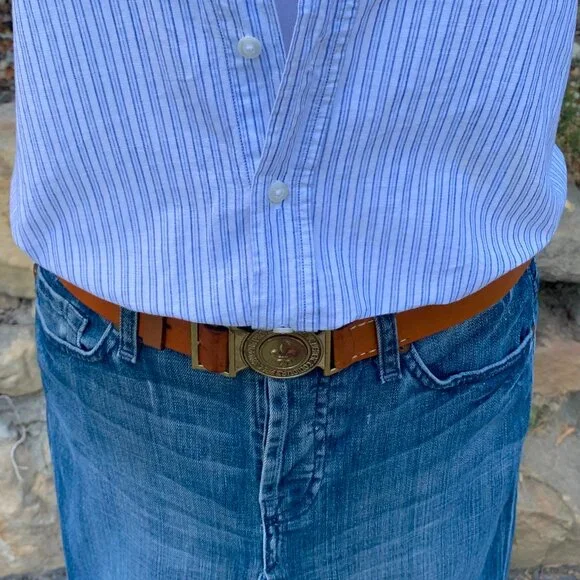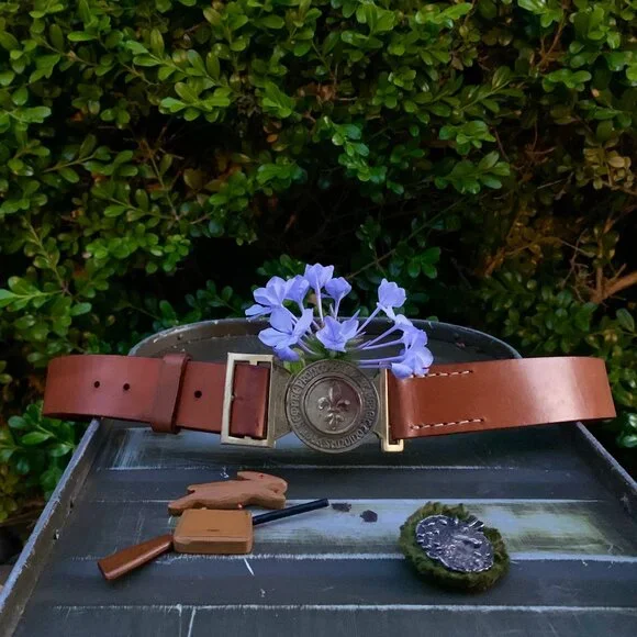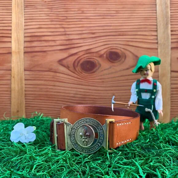 Cool kids have fresh eyes and a flair for the unexpected.They're inventive, open minded, and are inclusive. They tend to reuse, incorporate the obsolete, the inherited, and forgotten things with the new, to create their own unique look.Switzerland's trilingual Boy Scout motto "Allziet Bereit - Toujours Pret - Sempre Pronto"(Always Ready) represents Swiss Scouts of German, French, and Italian descent from different regions.This vintage interlocking fleur-de-lys insignia belt with the honey hued leather strap is the exclamation point to that ordinary pair of khaki, jeans, or white pants.Circumference measures approximately 34", leather strap 32", width 1.25", EU size 95. There's some age appropriate tarnish on the brass buckle, and the leather strap has a few minor hard to see blemishes, otherwise the belt is in excellent condition.