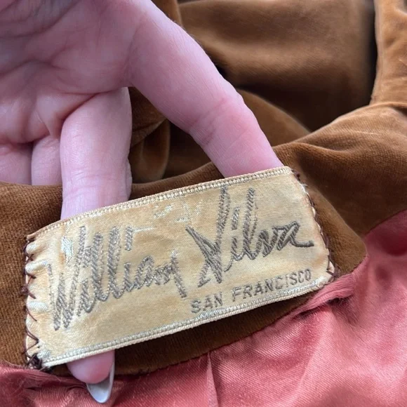 William Silva San Francisco Vintage Auburn Brown 1960s CoatAuburn orangey-brown knee-length fall coatSoft, lush fabric - tag does not indicate what the material is.Covered 2” large buttons three front, Two pockets at waist, Fully lined in pink salmon/orange color, darts at bust, 3/4 sleeve Lining & stitching is coming apart in some places, please see photographs. Some fabric has come off the sides of the buttons. Not in perfect condition, may be 60-70 years old.Label - William Silva SanFranciscoEra - 1960sSize - approx Medium (not on tag)Made - U.S.A.Measurements are taken flatAcross underarms - 25”Underarm to wrist hem - 8.5”Underarm to side waist hem - 25”Length (back center neck to back center bottom hem - 40”Arm opening at “wrist” - 8.5”Vintage Items are pre-loved for decades and may have flaws.Some items may have been mended and/or dry cleaned, some may need mending or cleaning
