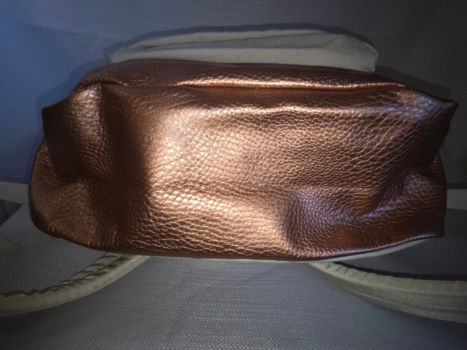 Backpack measures approx 16"x12"x5.5" with adjustable polyester straps and lining. It featured an exterior zip pocket that measures 9.5"x6"x2.5" with organizer pockets inside. Bag also has a rose gold vegan leather front key clip