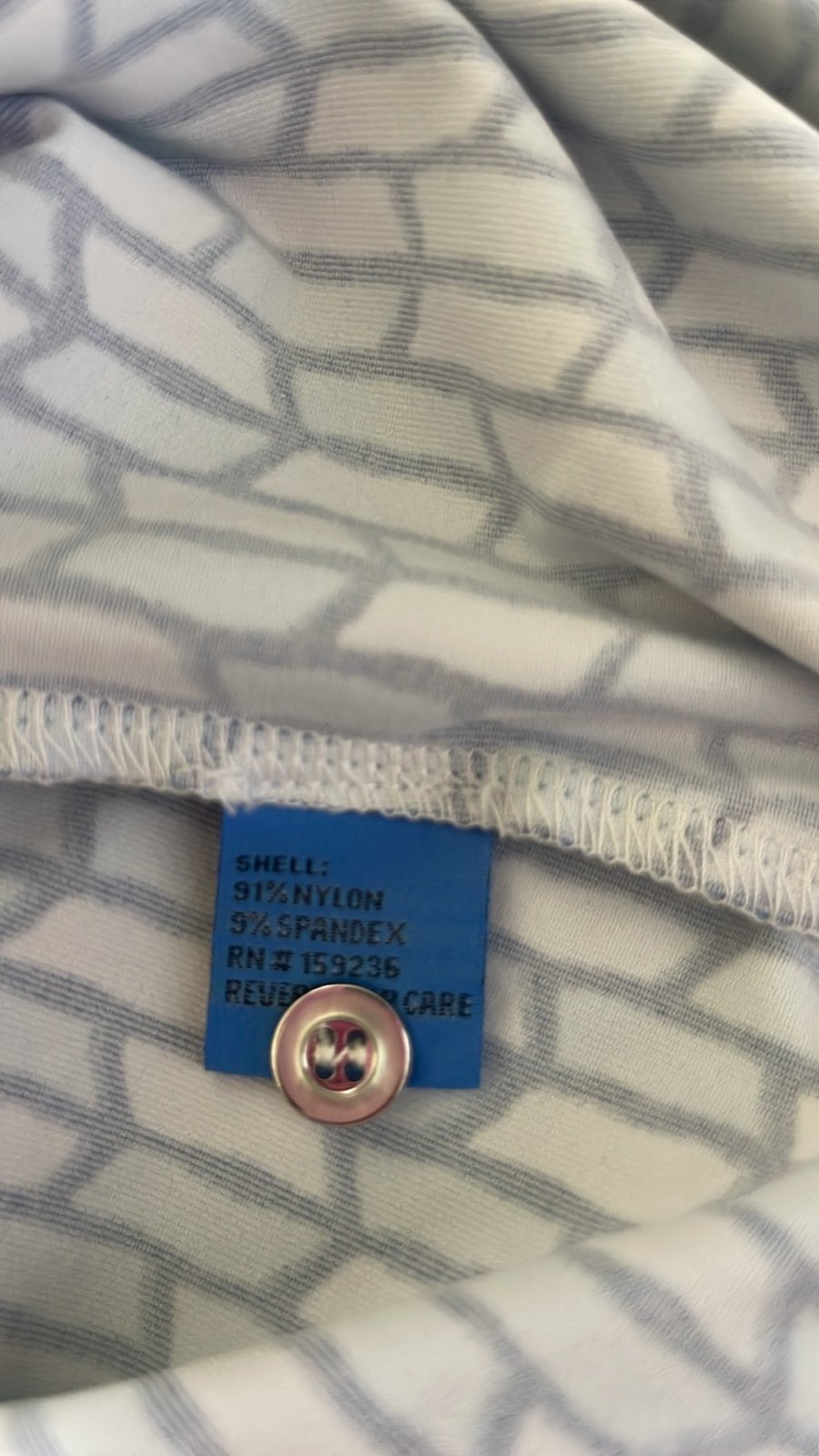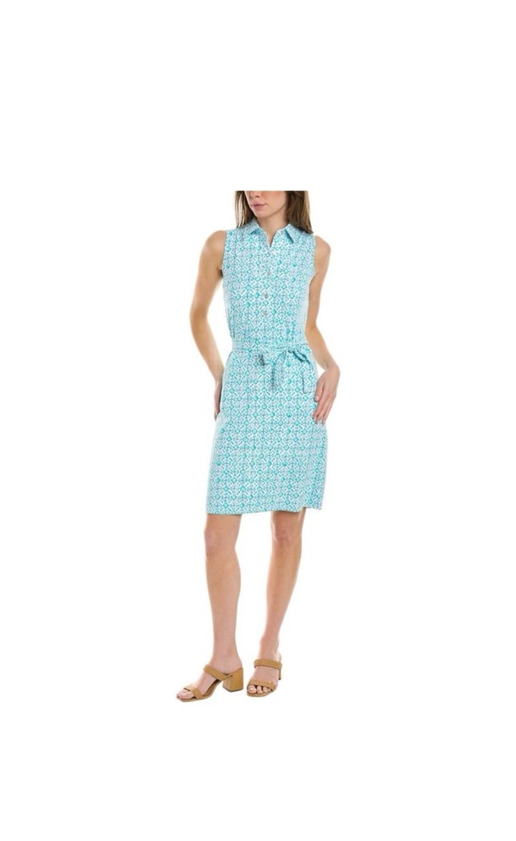 This stylish blue patterned sleeveless dress is perfect for any occasion. Its elegant design and comfortable fit make it a must-have in your wardrobe. J. McLaughlin Dolly Blue/Light blue mini chain link Geo sleeveless dress. Dresses hem falls right below the knee.