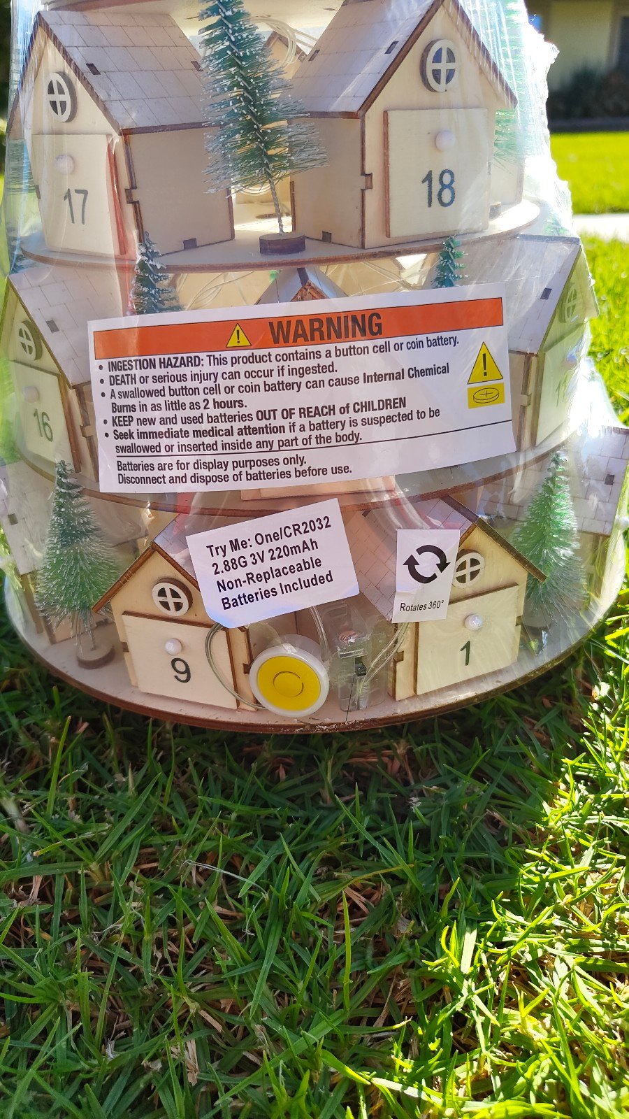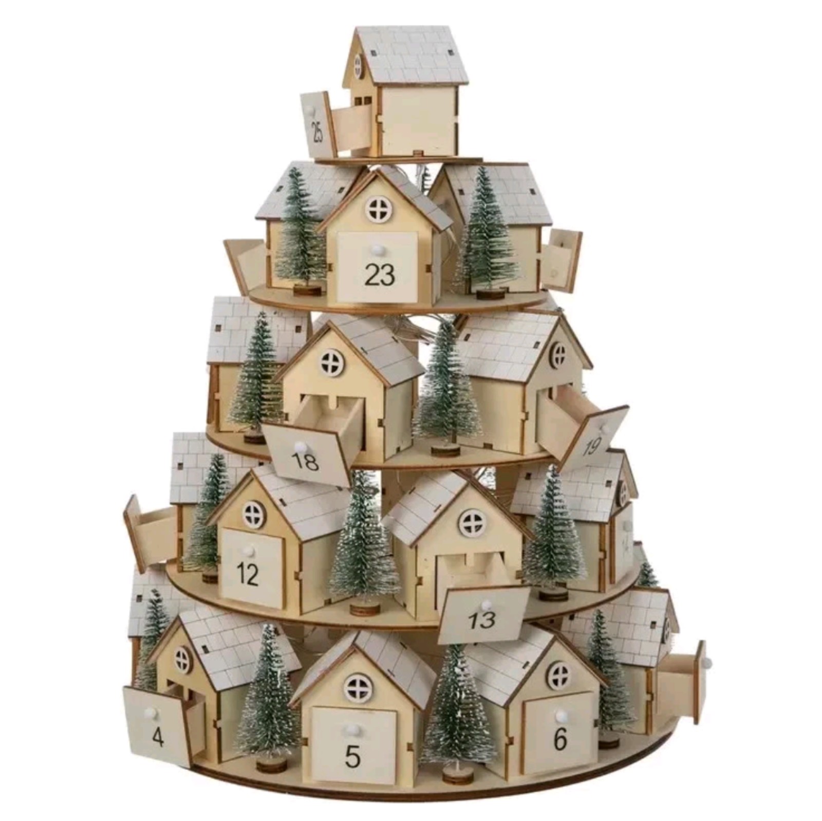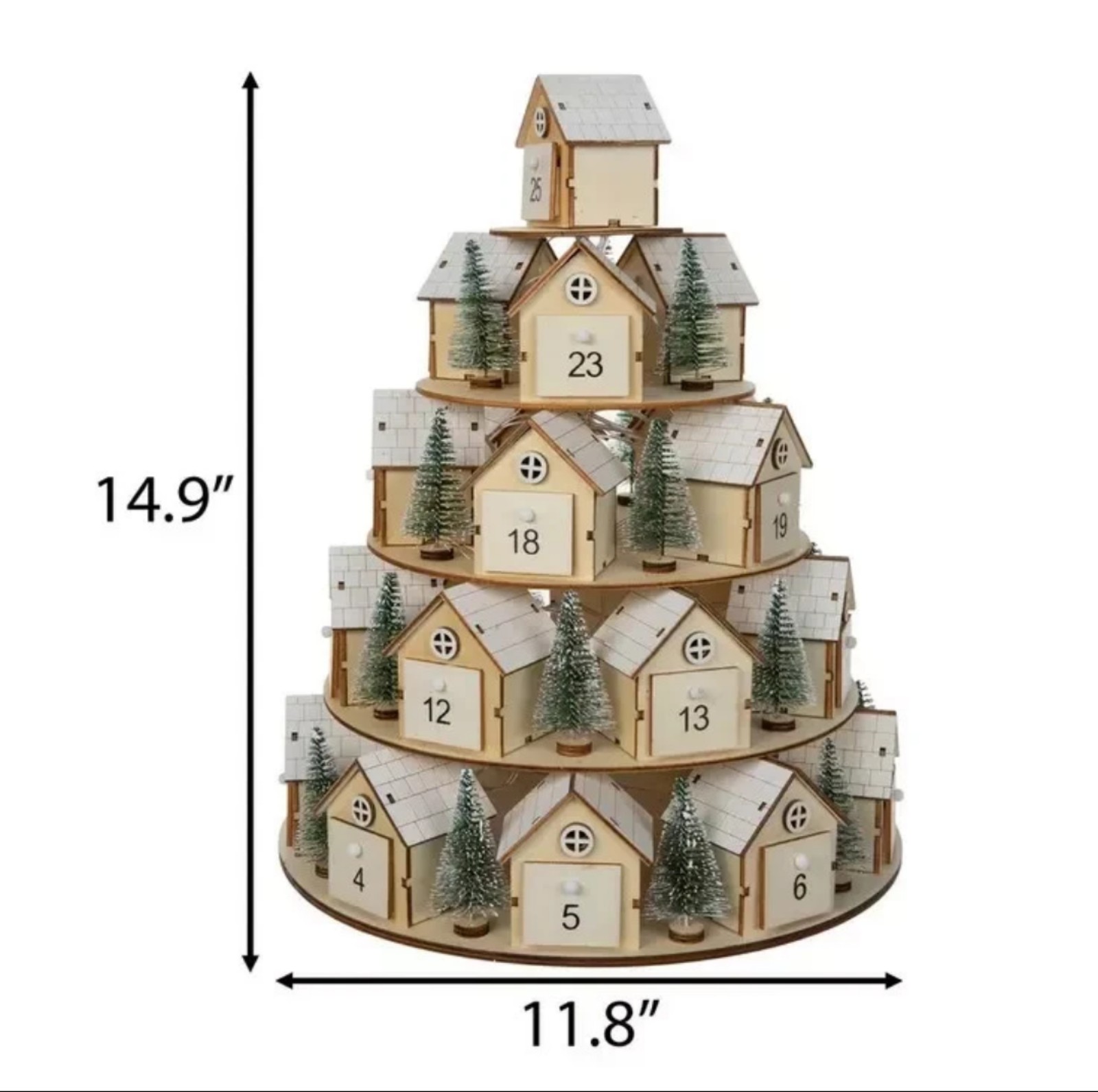 The Hobby Lobby Light Up 5 Tier Wooden Village Rotating Advent Calendar is a festive addition to your holiday decor. Made from plywood, MDF, and plastic, this medium-sized calendar features a neutral color palette and a holiday theme.