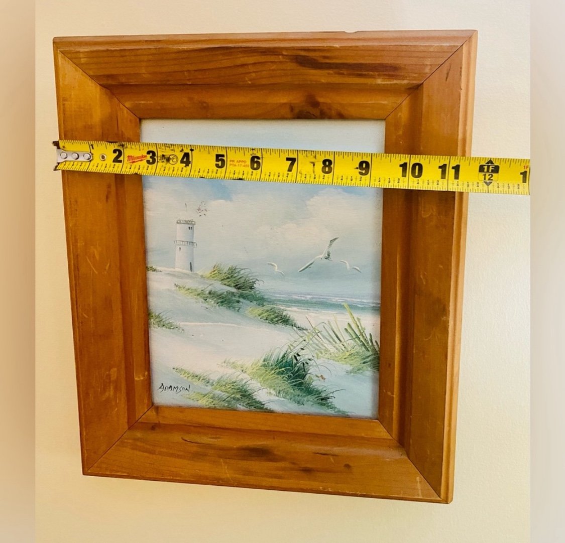Signed Lighthouse Ocean Beach Nautical Painting Raw Pine Frame Vintage Lighthouse Seascape Painting