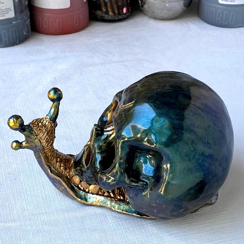 This is the one hundredth and sixty-second in a series of my snail skulls that are considered mini because they're smaller and cheaper than the others. This one (mini #162) has a smooth coil and has glazed paint on the skull, acrylic on the coil and a special concoction on the body frame. The rest is gold leaf paint. The reason that some of the prices are different from the others is because of the size, so please check the picture or video where I'm holding the piece to get an idea of its size based on my hand. I made this one by hand and it's made from cone 5 ceramic clay. If you're buying from outside the U.S., make sure to check your countries' custom fees, taxes and shipping wait times. Each piece has a signature stamp on the bottom to verify its authenticity. This would make a great one of kind gift, so hurry before it's too late.