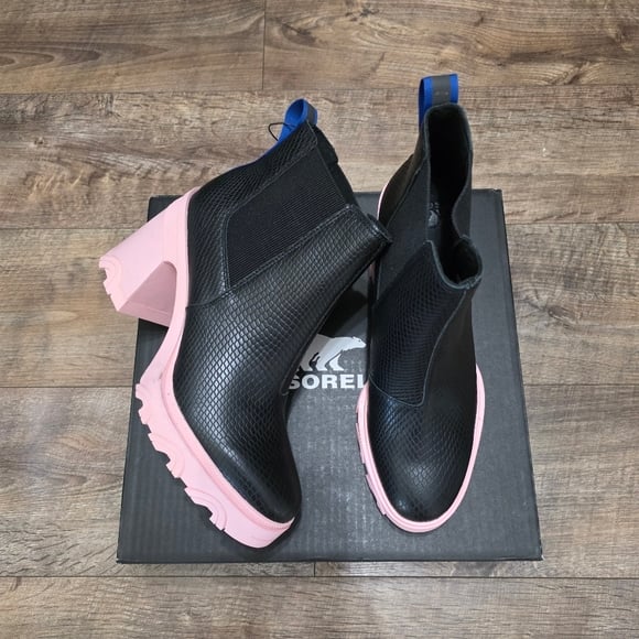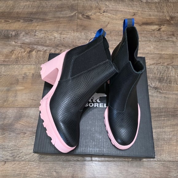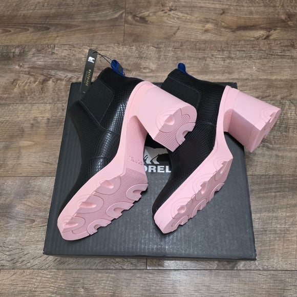 Step out in style with these Sorel. women's ankle boots. Featuring a sleek black design with a bold pink sole, these boots offer both fashion and function. Perfect for any occasion. Women's 10. Retails $180