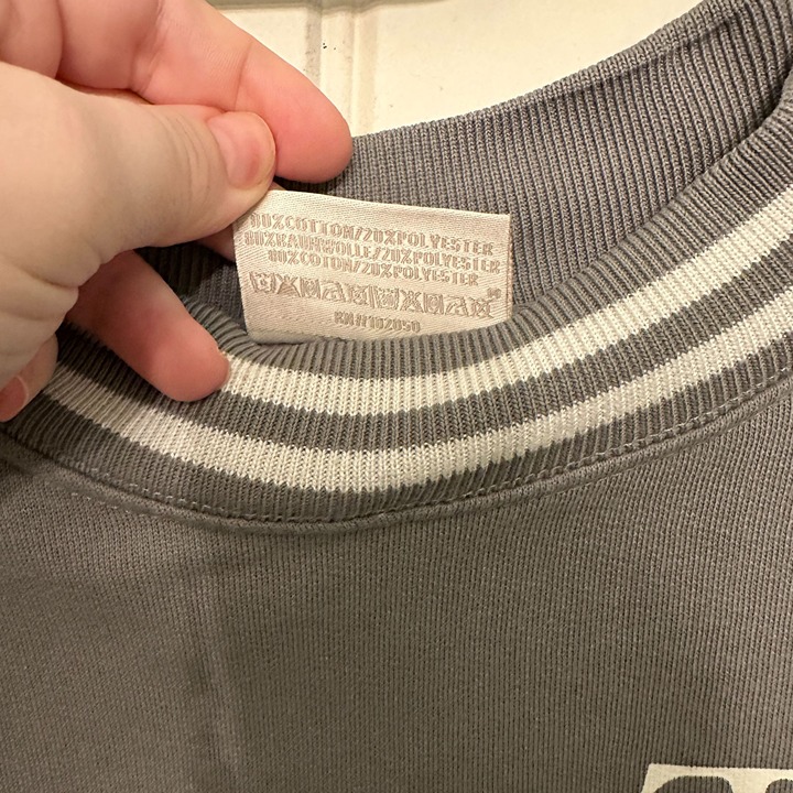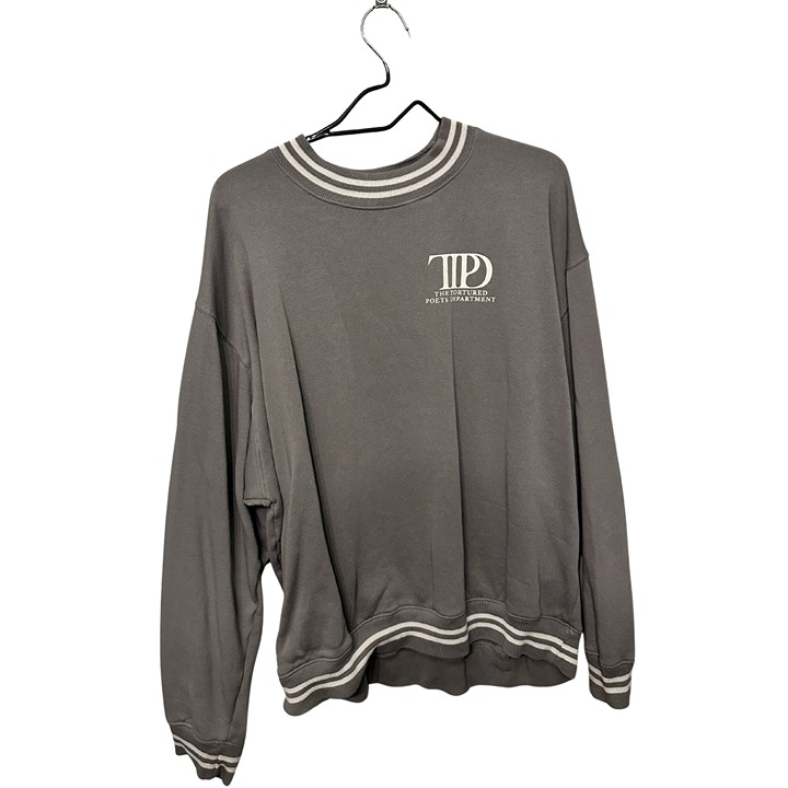 Gray crewneck sweater featuring parchment white contrast striped ribbing at collar, waist, and wrists with "TTPD" album logo and "The Tortured Poets Department" printed on wearer's front left chest.
