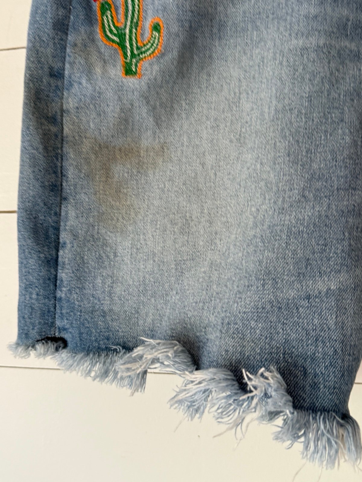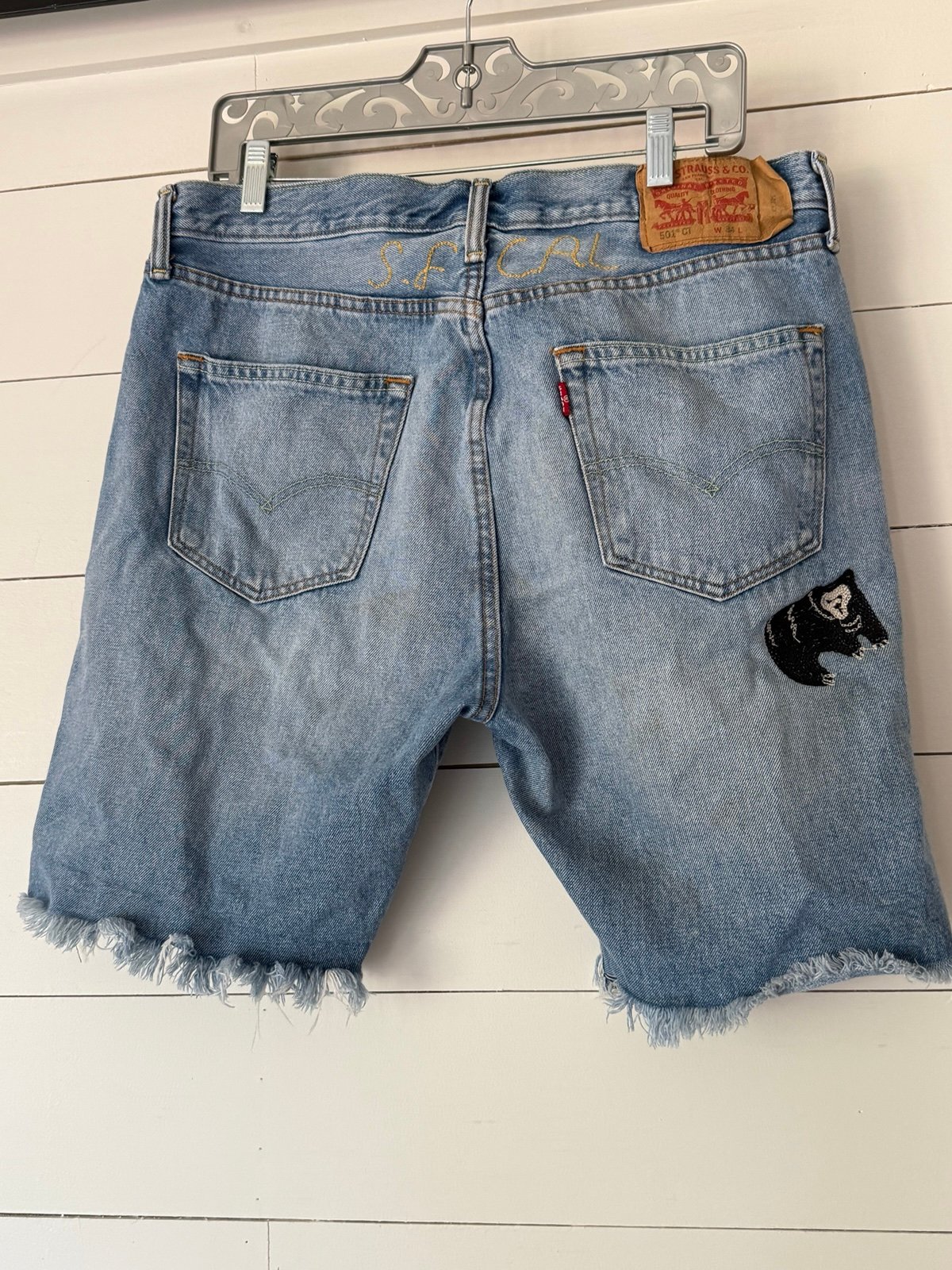 Vintage LEVI’S 501 RETRO DENIM SHORTS CHAIN STITCHED EMBROIDERED Size 34 RARE design made by Levi’s. They’re in good used vintage condition. They do have some staining (please see all pics) but I also think it adds character to these one of a kind shorts. It’s all things California with these! Measures approx 34” waist, 19.5” outer length, 8.5” inseam. 100% cotton.